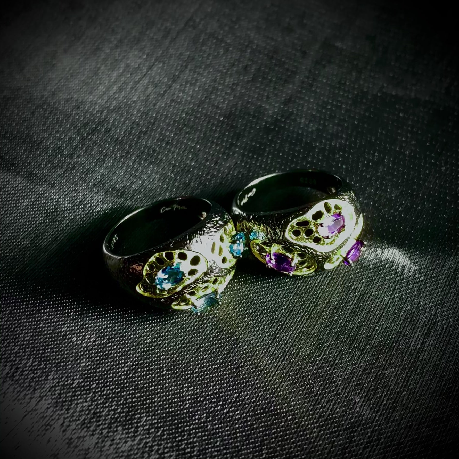 Sterling silver art ring with high-tech Sn-Ni alloy plating; golden carved plating and gleamy gemstones construct a charismatic highlight.