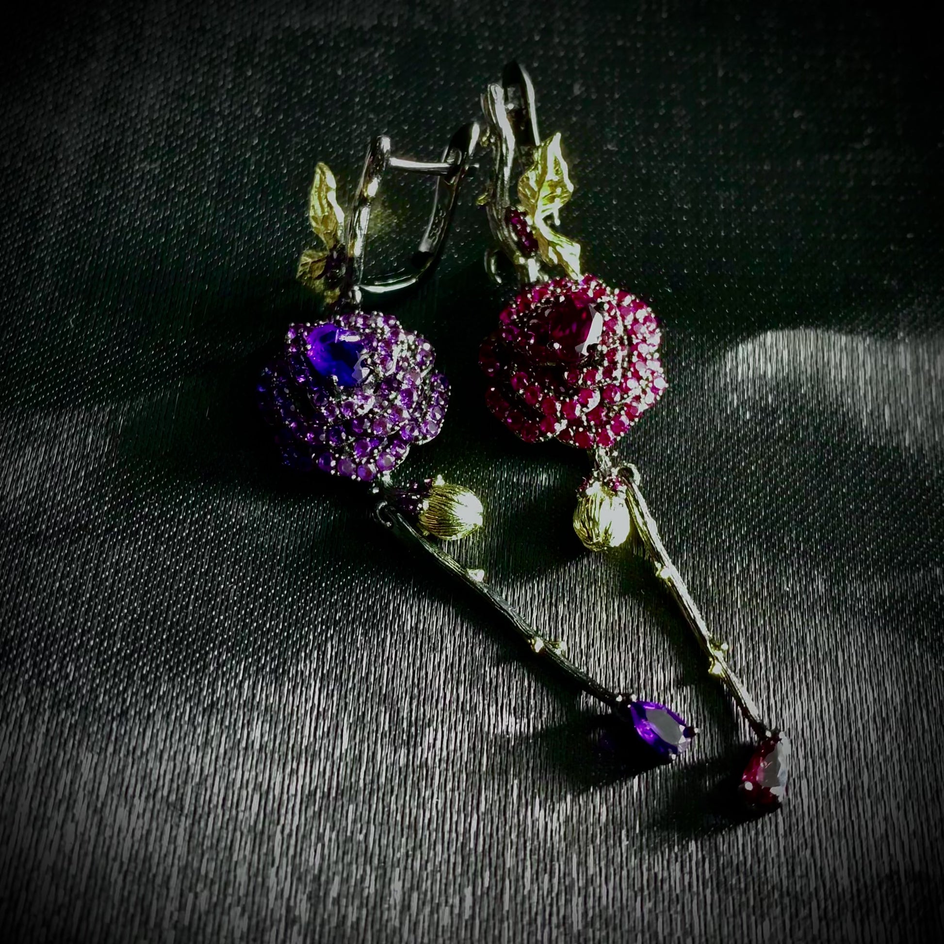 Thorny-rose shaped sterling silver art earring veiled with dark Sn-Ni alloy plating, micro gemstones construct roses of your scent and mystery.