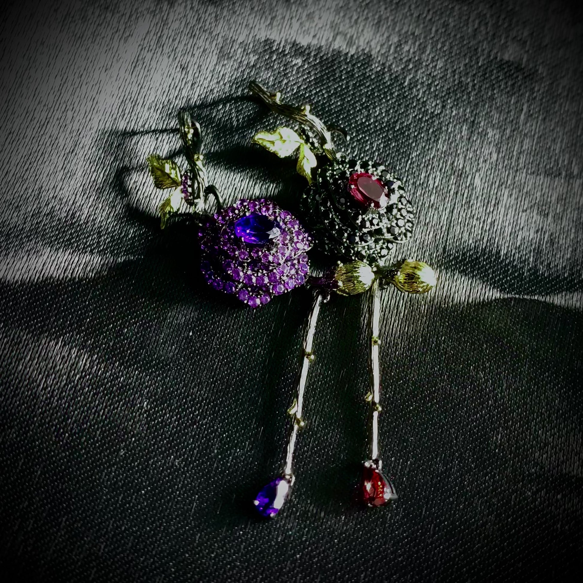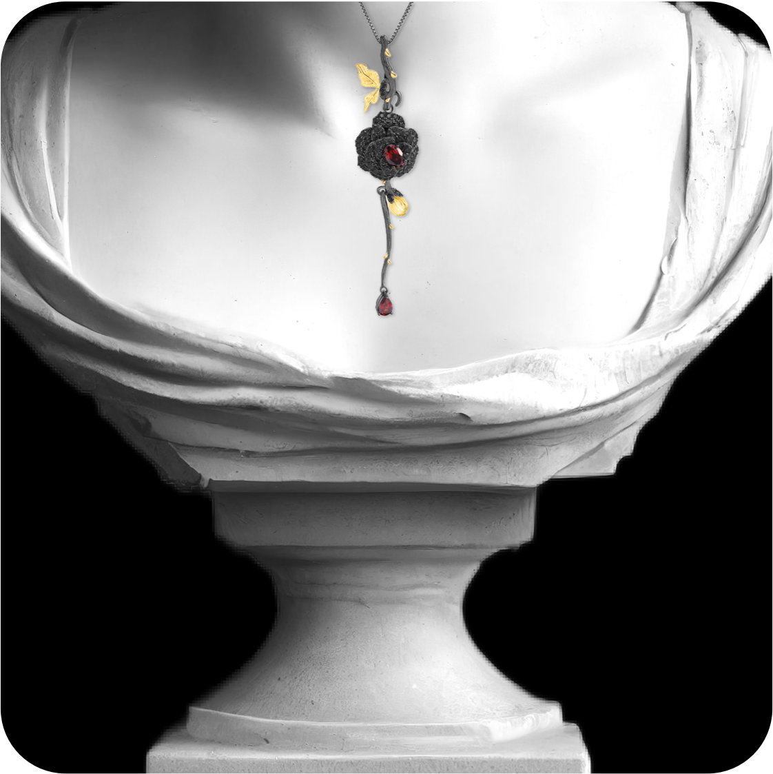 Thorny-rose shaped sterling silver art necklace veiled with dark Sn-Ni alloy plating, micro gemstones construct roses of your scent and mystery.