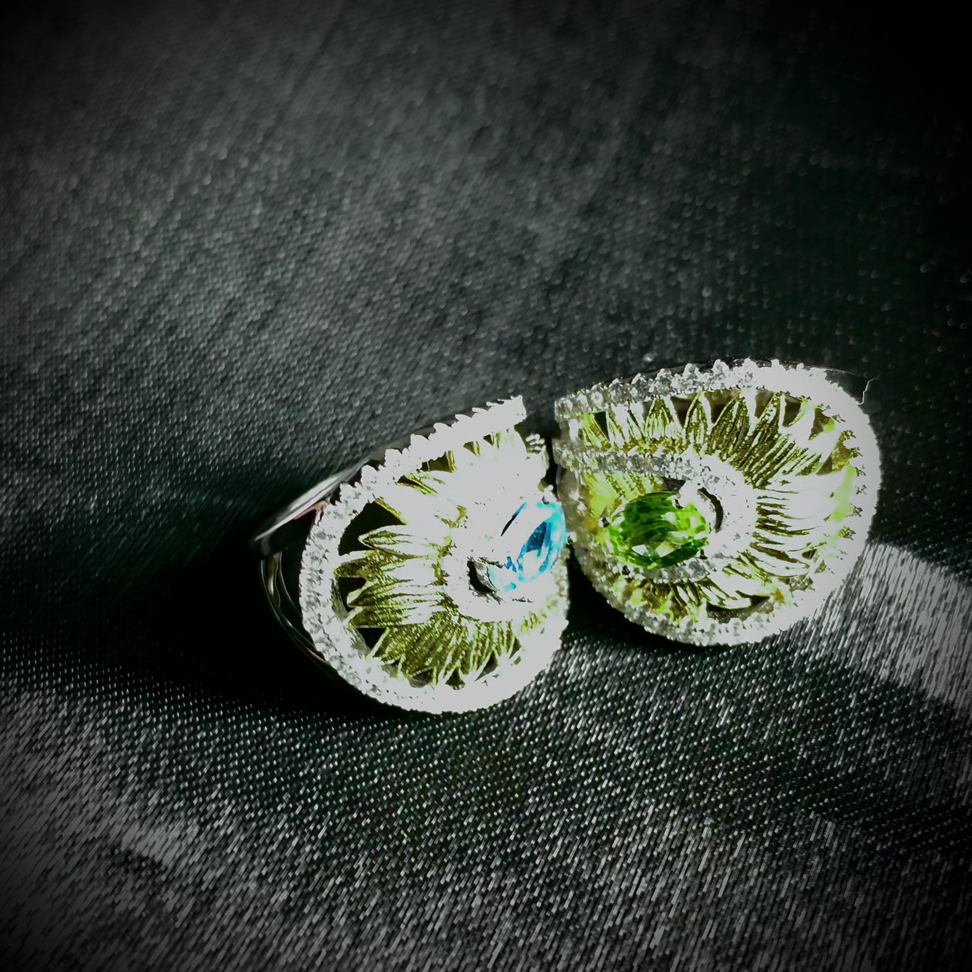 Sterling silver art ring inspired by the solar corona. When the tender gemstone is engraved in the golden solar waves, do you think they generate stars?
